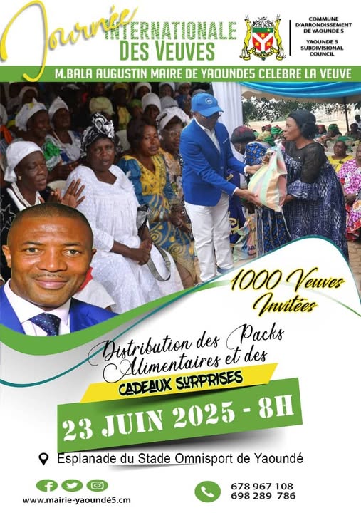 Comme il est de tradition depuis son élection à la tête de l’Exécutif Municipal de la Commune d’Arrondissement de Yaoundé 5 en 2020, le Maire Augustin BALA sera en totale communion avec les veuves de Yaoundé 5, le lundi 23 juin 2025 à partir de 08 heures sur l’esplanade du stade omnisports de Yaoundé Mfandena.