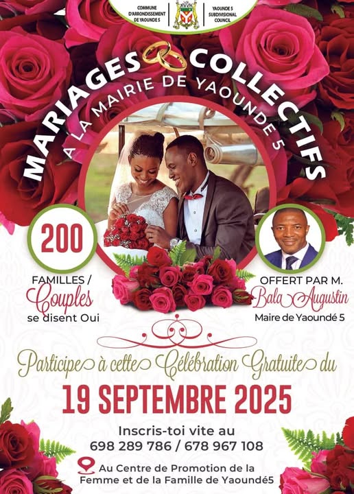 Le Maire Augustin BALA organise les mariages collectifs gratuits pour les populations de Yaoundé 5 , le 19 septembre 2025 au Centre de Promotion de la Femme et de la Famille de Yaoundé 5.